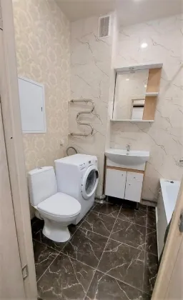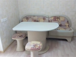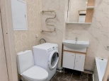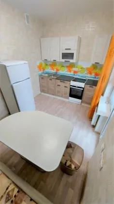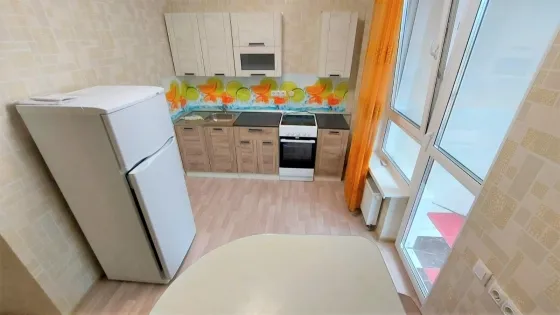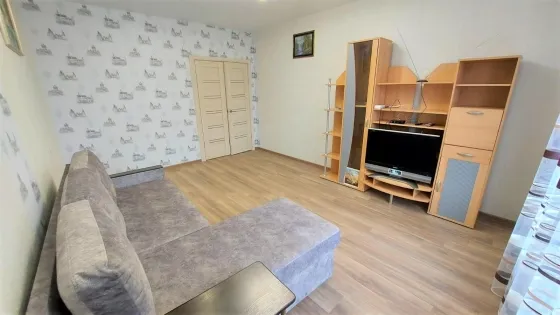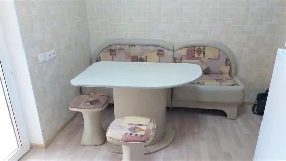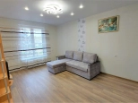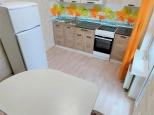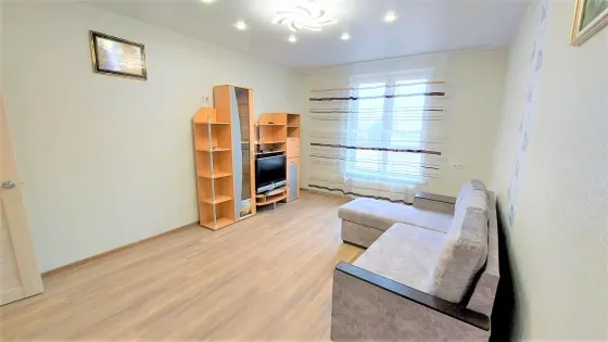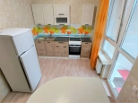 Спальня - двухспальная диван-кровать, стенка с телевизором, шкафы. На кухне- кухонный гарнитур, электроплита с духовкой., кухонный уголок со стульями, холодильник. С кухни выход на балкон с панорамным видом во двор и на город. Санузел совмещенный. Ванная, унитаз, умывальникк с тумбой и зеркалом. Стиральная машина.